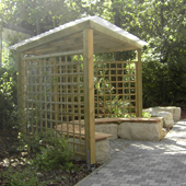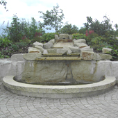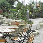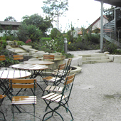 Ein Senkgarten für die Mittagspause der Mitarbeiter bereichert die Firma um einen weiteren Aufenthaltsraum. Der Brunnen mit Wasserfall übertönt die Geräusche der nahen Straße und ein überdachter Sitzplatz lässt die Raucher nicht im Regen stehen.