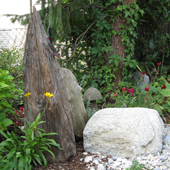 Die alten Waschbetonplatten wurden durch einen Quarzitbelag in warmen Rot-Gelb-Tönen ausgetauscht. Die verschiedenen Plattenformate kennzeichnen einzelne Funktionsbereiche. Ein Kiesbeet mit Gräsern verbindet Terrasse mit Garten und schafft Weite. Die vorhandene Bepflanzung wird behutsam ergänzt und erneuert. Ein Quellstein, der eine angenehme Geräuschkulisse bildet, rundet das Ganze ab.